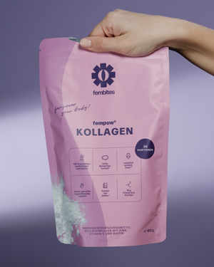 Kollagen ist ein strukturgebendes Protein, das der Körper ab dem 25. Lebensjahr zunehmend abbaut. Über die Nahrung lässt sich dieser Verlust kaum ausgleichen – und viele Kollagenquellen sind nicht bioverfügbar. fempow KOLLAGEN liefert hydrolysiertes Typ-1-Kollagen, das wissenschaftlich nachgewiesen vom Körper aufgenommen und in die Haut eingebaut wird – gemeinsam mit Co-Faktoren wie Vitamin C, die das Ganze verstärken.